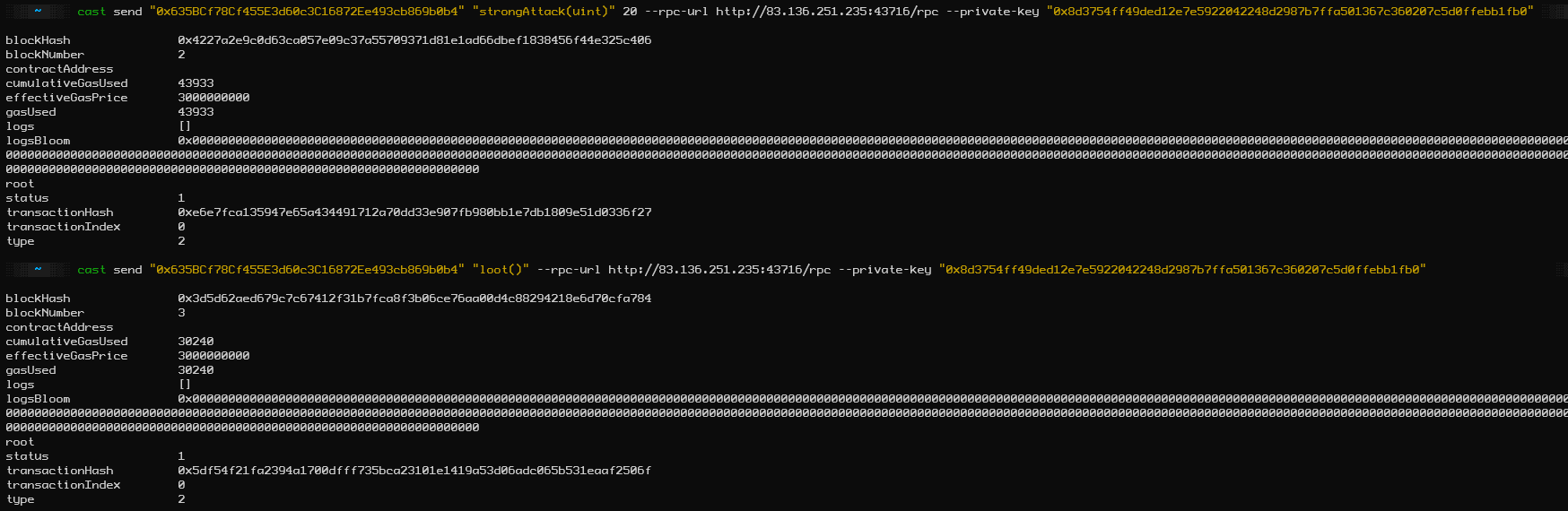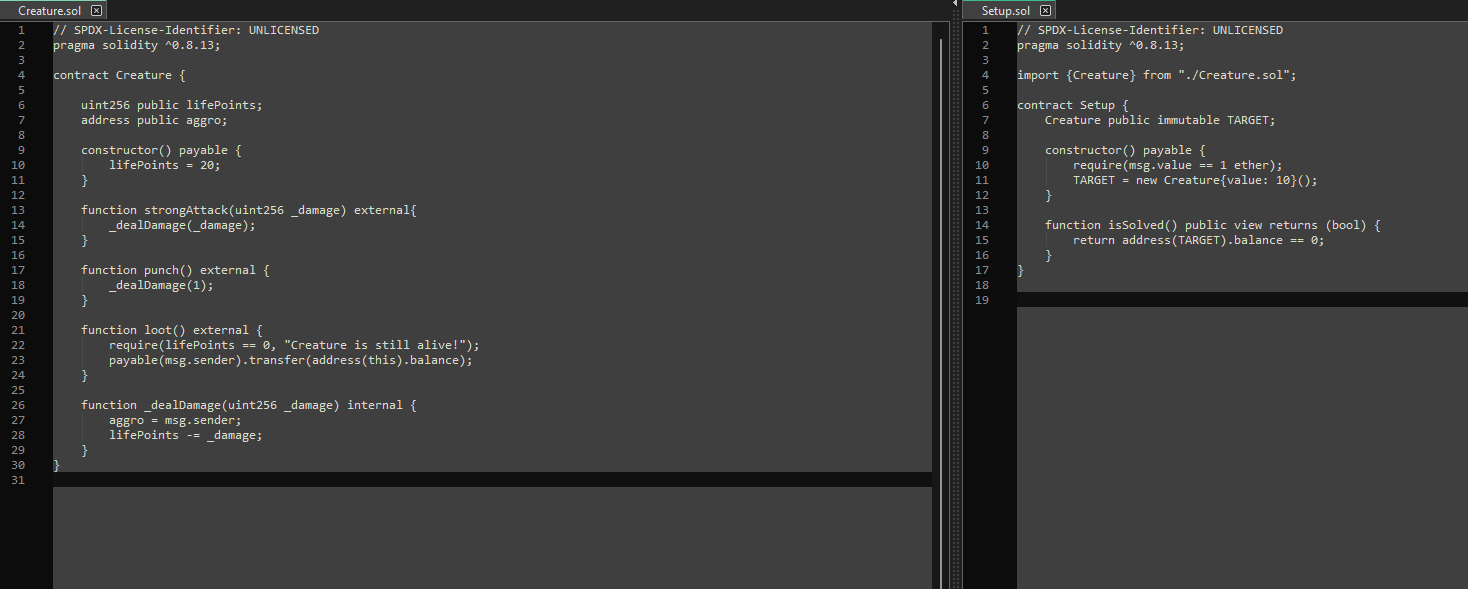 The Files are two sol smart contracts, one is Setup.sol and one is Creature.sol . In Setup.sol we find the function isSolved() which is satisfied when the Target-Address is 0 and in the Creature.sol we got the constructor with lifePoints of 20. Moreover the function punch deals 1 Damage but the strongAttack function is depending on the parameter _damage. So in conclusion we need to transfer(Damage) 20 to the address to solve the Challange.