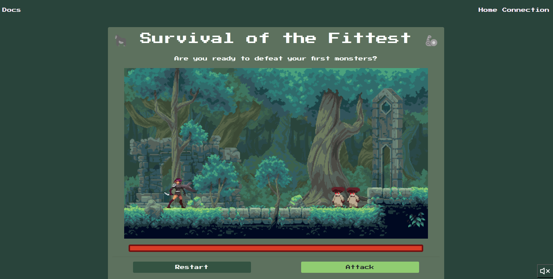 At the Home site we got different links and a small game with two buttons Restart calls /restart and Attack calls the /flag